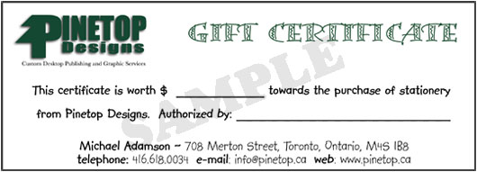 To order gift certificates - contact us by   e-mail: orders@pinetop.ca