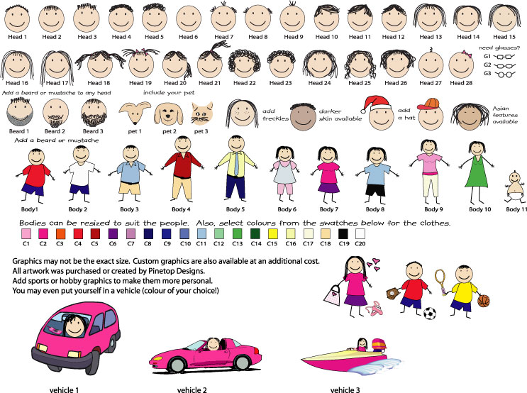 There are literally hundreds of possible graphics that can be customized by changing colour or size allowing you to have exactly what you want.